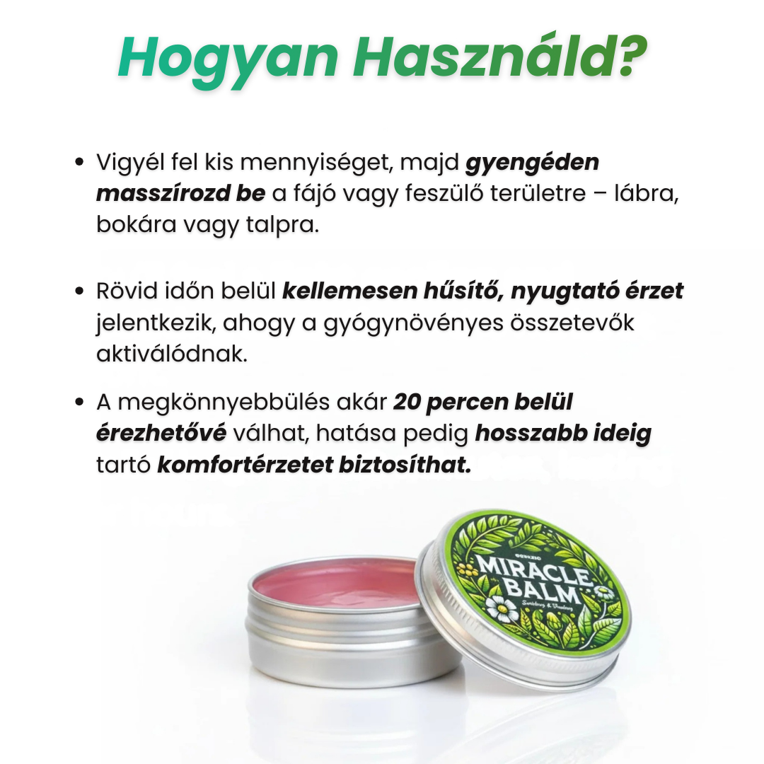 Vigyen fel egy kis mennyiséget a problémás területre (pl. láb, boka, vádli), és finoman masszírozza be. Használható naponta többször is, ahogy szükség van rá.