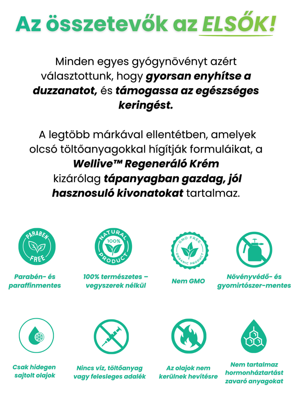 Igen — a Wellive krém vegyszerektől, parabénektől és irritáló adalékanyagoktól mentes formulával készült, így napi használatra alkalmas. Mindig végezzen bőrpróbát egy kis területen, ha érzékeny a bőre.