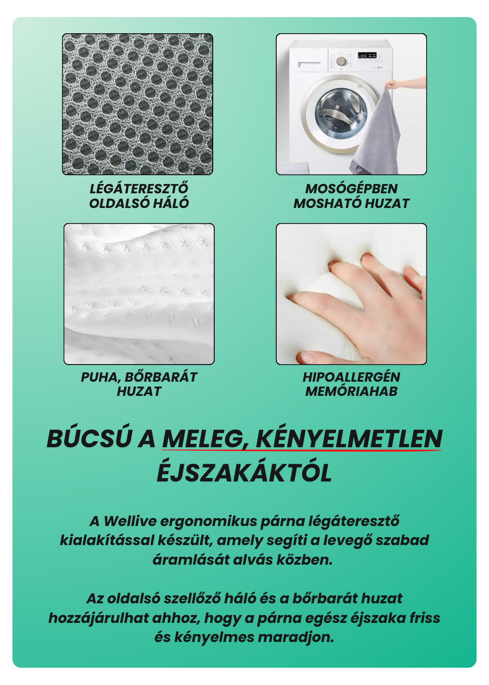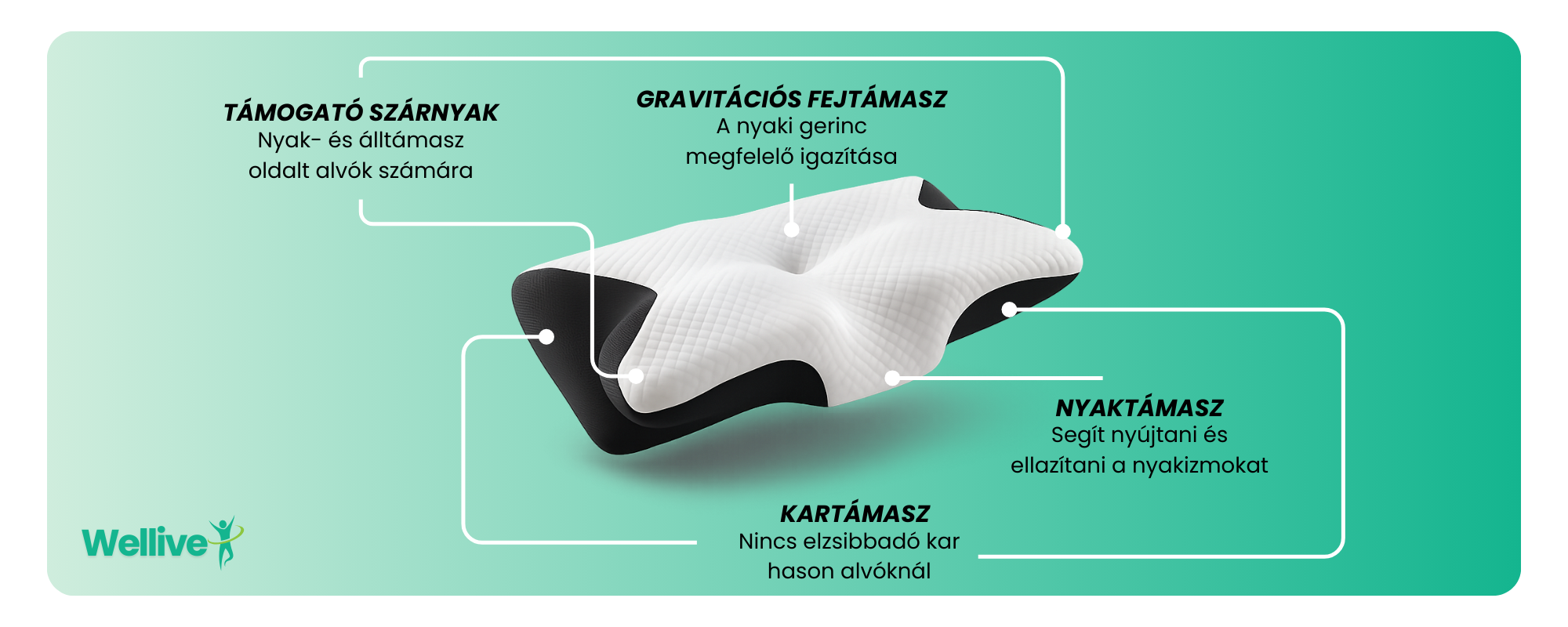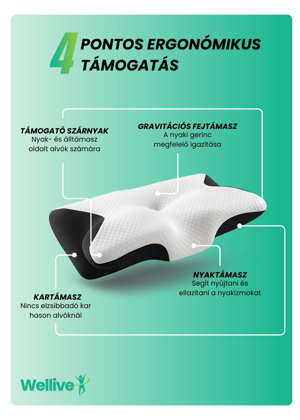 A Wellive párna prémium memóriahabból készült, amely alkalmazkodik a fej és a nyak formájához. Nem túl puha és nem túl kemény úgy lett kialakítva, hogy stabil, mégis kényelmes alátámasztást biztosítson.