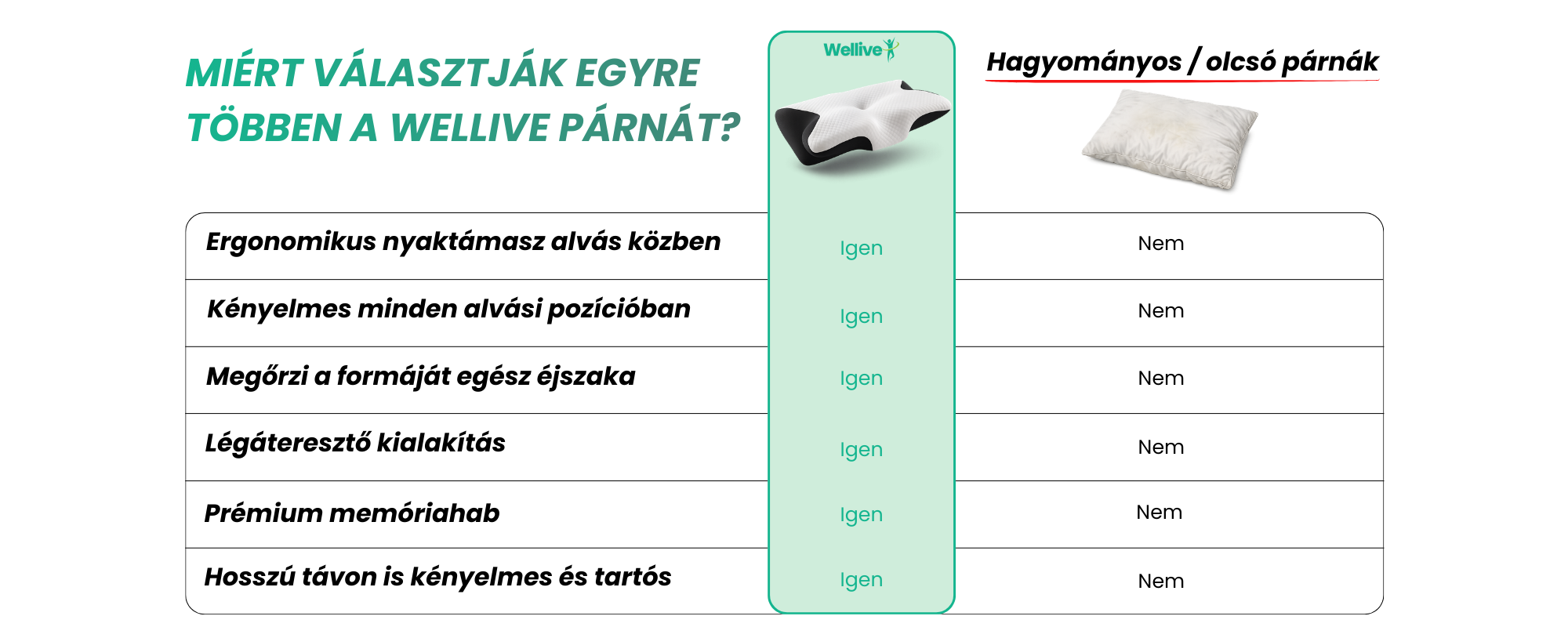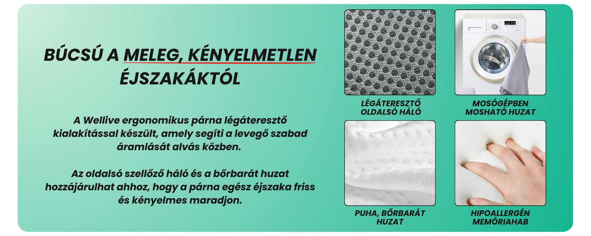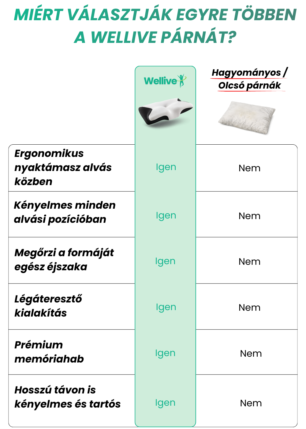 A Wellive párna prémium memóriahabból készült, amely alkalmazkodik a fej és a nyak formájához. Nem túl puha és nem túl kemény úgy lett kialakítva, hogy stabil, mégis kényelmes alátámasztást biztosítson.
